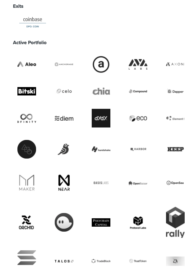 最新のポートフォリオはa16zのHPの仮想通貨ポートフォリオを確認